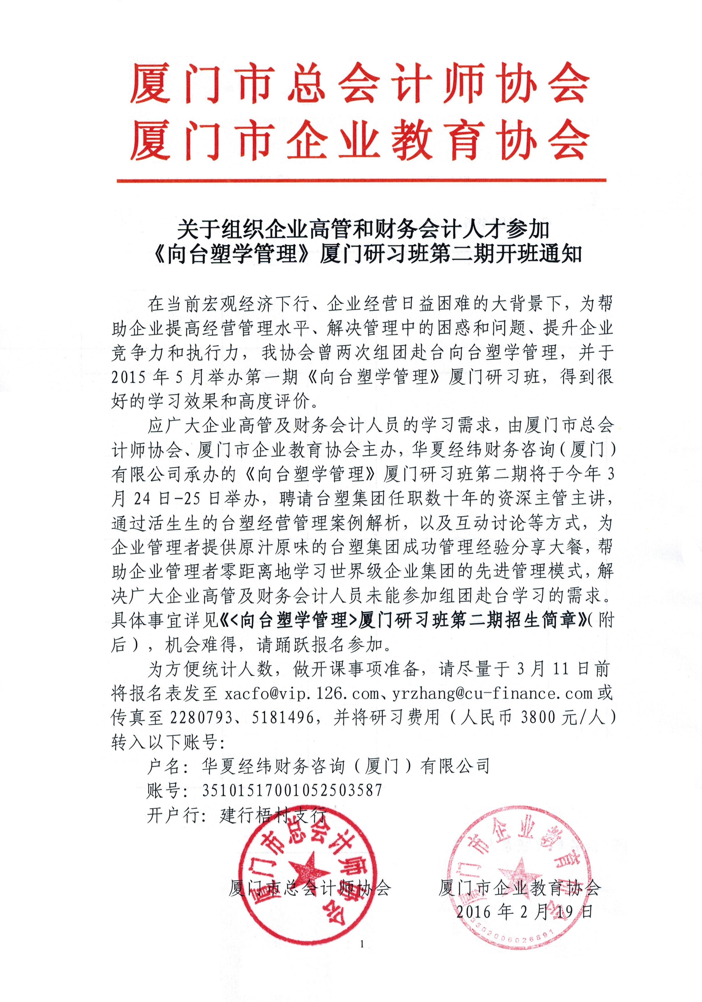 關(guān)于組織企業(yè)高管和財(cái)務(wù)會計(jì)人才參加《向臺塑學(xué)管理》廈門研習(xí)班第二期的通知