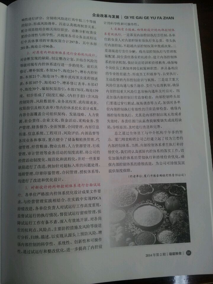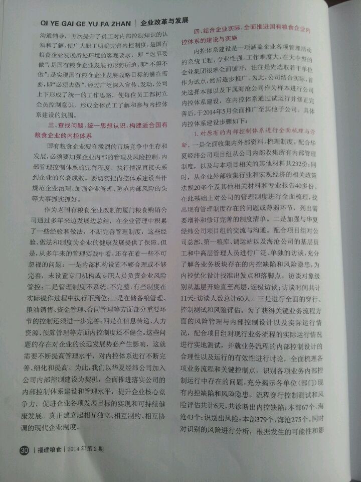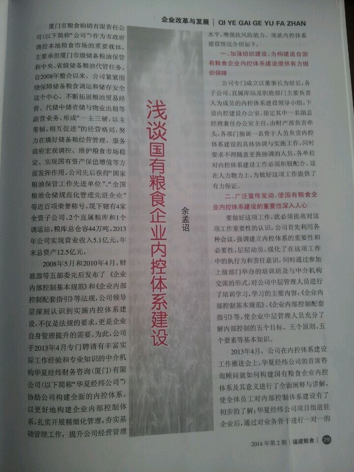 2014年6月份,廈門市糧食購銷有限責任公司財務(wù)部余孟詔經(jīng)理在由福建省糧食局、福建省糧食行業(yè)協(xié)會聯(lián)合舉辦的刊物《福建糧食》2014年第二期上發(fā)表了《淺談國有糧食企業(yè)內(nèi)控建設(shè)》的文章。文章中闡述了2013年華夏經(jīng)緯財務(wù)咨詢(廈門)有限公司協(xié)助廈門糧食購銷公司建立起了較為完善的內(nèi)部控制體系,為廈門糧食購銷公司的穩(wěn)健持續(xù)發(fā)展提供了優(yōu)良的內(nèi)控環(huán)境。